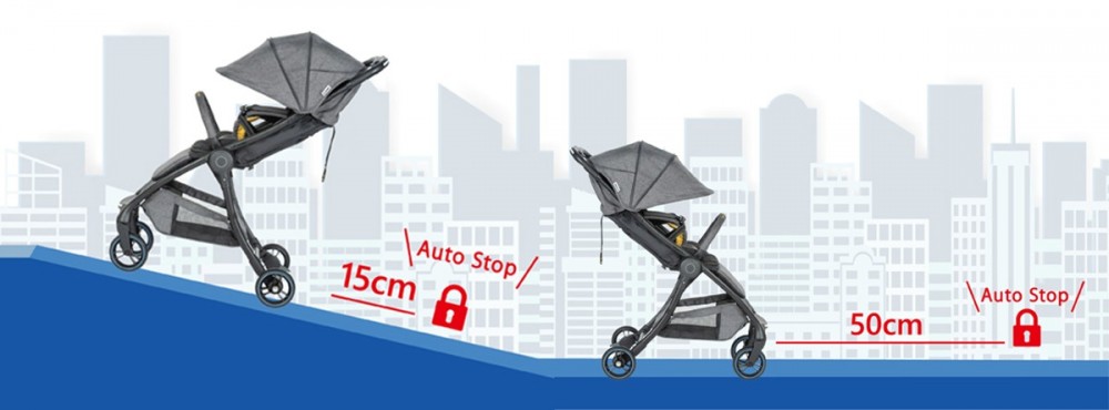 主動式安全系統Visi-Safe可預防大人疏忽,就算有時候BB車於平地不小心滑走時,亦可以即時「Auto Stop」,50厘米後BB車將自動煞停;而若是在超過4度的斜坡上滑坎,15厘米內就會啟動自動煞停。