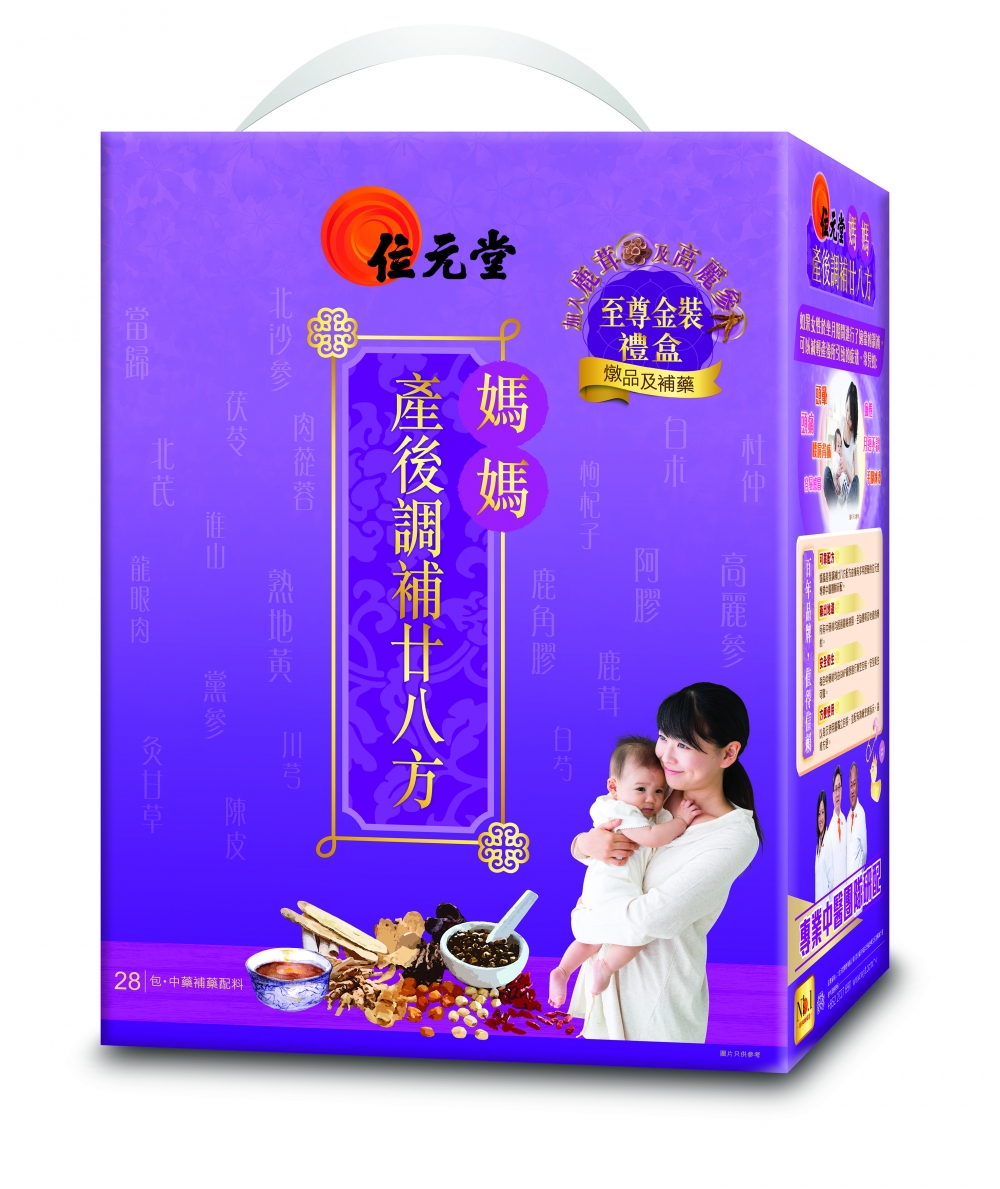 媽媽在坐月期間,可以「位元堂媽媽產後調補廿八方」調補身體,廿八劑補藥共分為四個階段,專為提升媽媽免疫力而設,包括高麗蔘、黨參、白朮、茯苓、當歸、阿膠、黃芪等等。按時服用,媽媽就能迅速調補體質,加速產後身體復元,免疫力大提升!