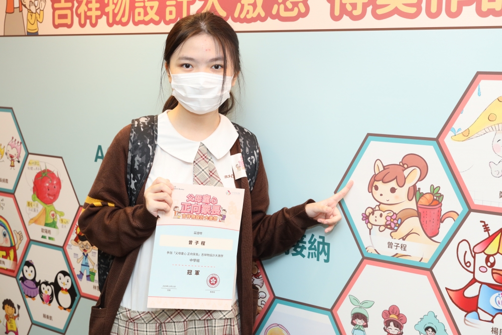 當日除了是頒獎典禮外,亦是得獎作品展覽,每幅作品都是獨一無二,充滿著滿滿的愛。提到創作靈感,榮獲中學組冠軍的曾同學就說他的設計靈感是來自她對媽媽的感覺,袋鼠是代表著媽媽,而袋裡的小袋鼠就是她自己,就像媽媽平時愛護她一樣。