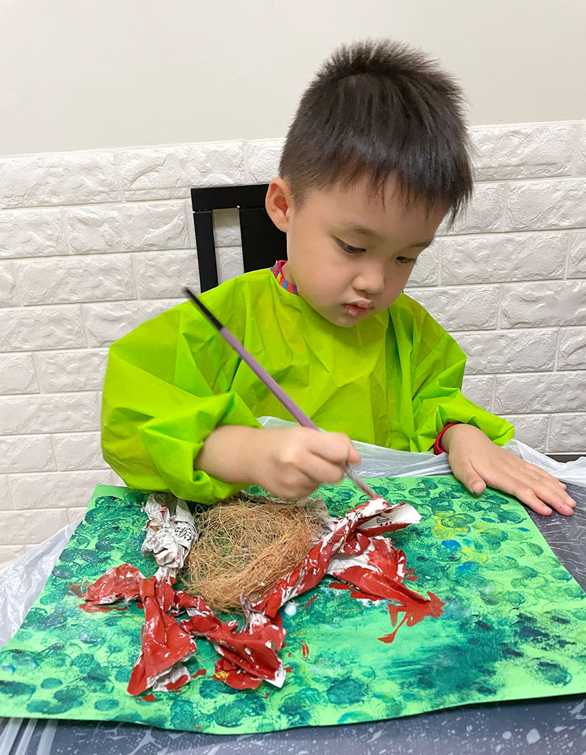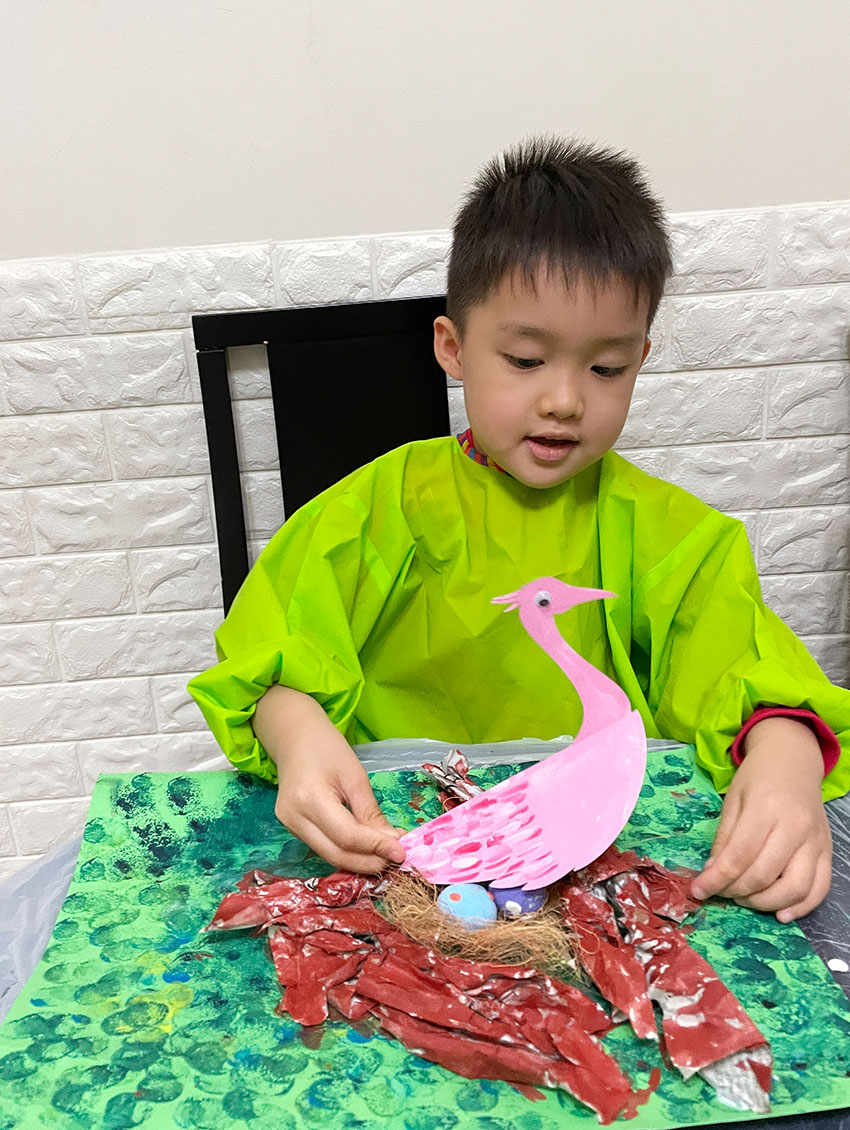 有一次同Aidan一齊睇左套小鳥築巢和孵蛋的紀錄片,趁佢印象仲深刻,就同佢一齊創作一個小鳥的家,鳥巢內仲有雀仔蛋,可以俾哥哥模仿鳥媽媽孵蛋的情景,好玩又有趣。哥哥而家每日起身都去望下鳥媽媽下面的雀仔蛋,睇吓有冇小鳥出世,好攪笑,我諗下次要整番幾隻小鳥BB先得啦!