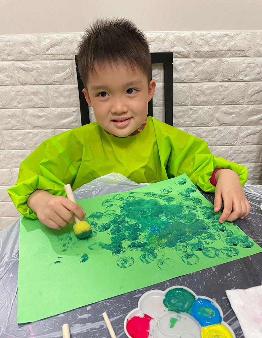 - 在色紙上用海棉棒印樹葉,可以用不同深淺的綠色