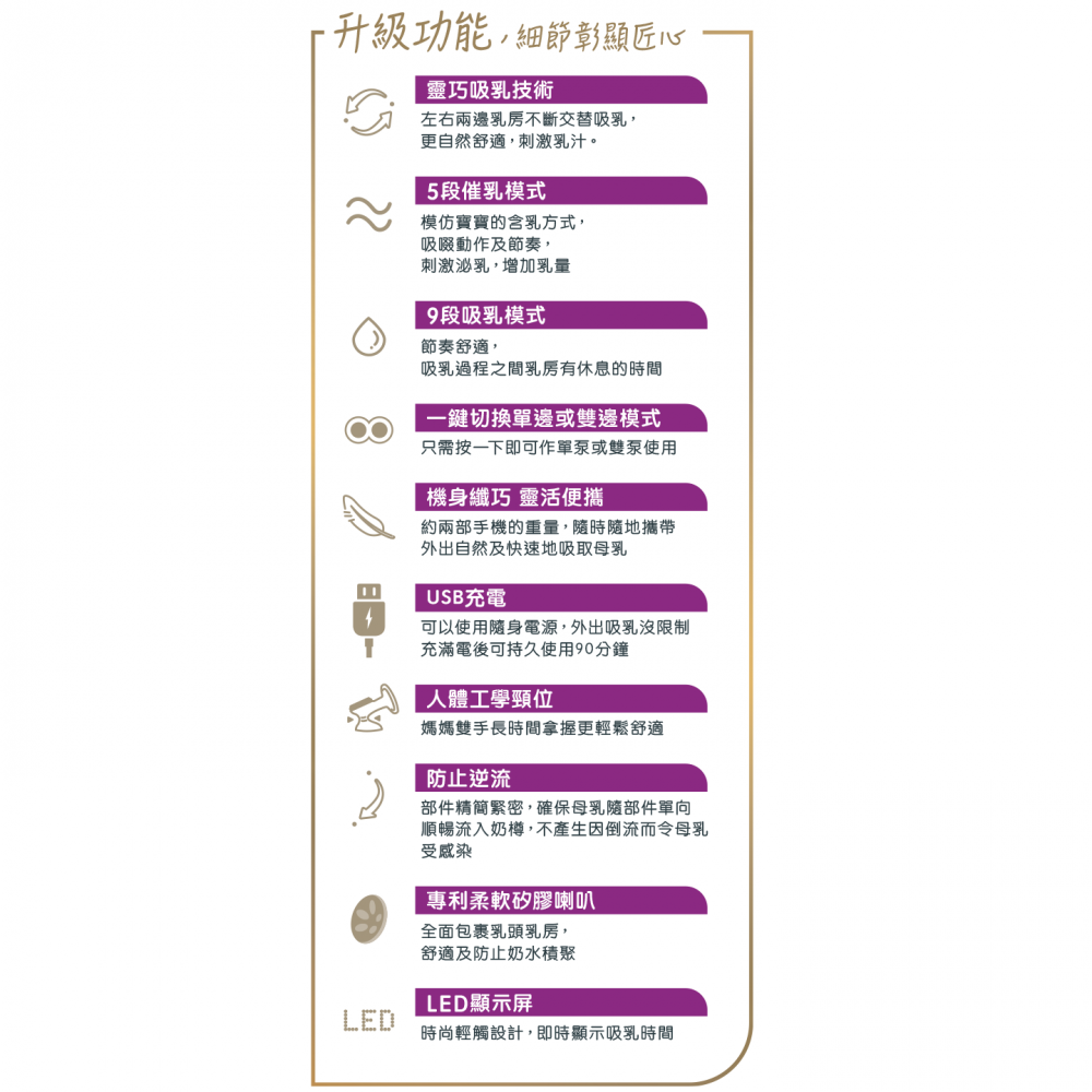 新手媽媽每次餵哺時都是一大挑戰,Made for Me雙邊電動吸乳器比坊間的泵奶器更輕巧及超寧靜,特有的左右交替吸乳,促進乳汁自然分泌,封閉式設計滴水不漏,讓媽媽在餵哺的過程可以更輕鬆順利。