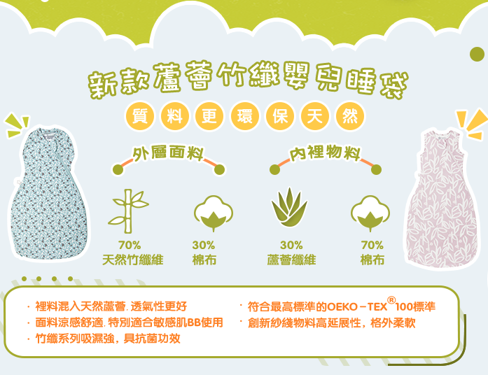 「新升級ALOEKIND™️蘆薈竹纖維嬰兒睡袋套裝」採用ALOEKIND™物料製成,使用100%柔軟及富有彈性棉布料,並混入天然蘆薈,透氣度高且不刺激皮膚,特別適合敏感肌寶寶使用;外層則是70%竹纖維及30%綿布而成,竹纖系列吸濕強,具有吸濕排汗及抗菌功效,夏天保持涼爽,冬天保持溫暖;並通過Oeko-Tex®100標準1級認證,表示睡袋不含有害化學物質、毒素和刺激性物質;創新紗綫物料高延展性,質地份外柔軟輕盈,舒適感覺讓寶寶穿著時不易抗拒!