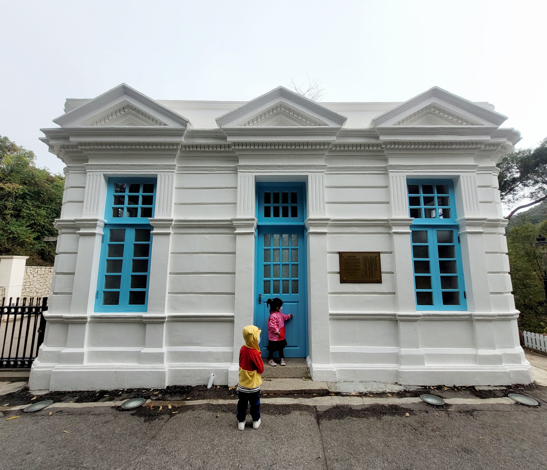 入口的藍白小屋是是守衛室,被列為香港法定古蹟呢!