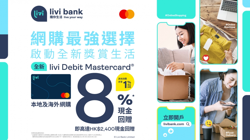 livi Debit Mastercard®網上消費可享8%現金回贈^
