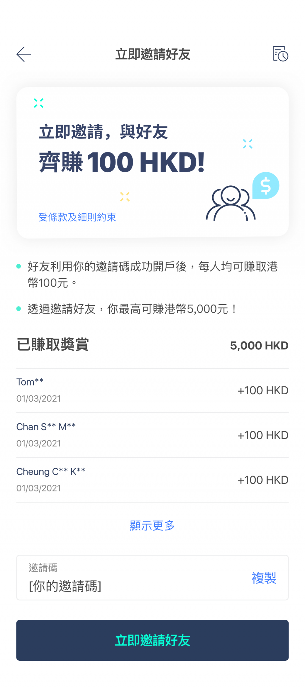 除了現金回贈外,livi bank的另一賣點一定是用戶推薦獎賞,只要以邀請碼成功開戶,不論是推薦者或是新用戶,大家都可獲HK$100推薦獎賞,名額最多50個,換句話說,最高可賺達HK$5,000獎賞。