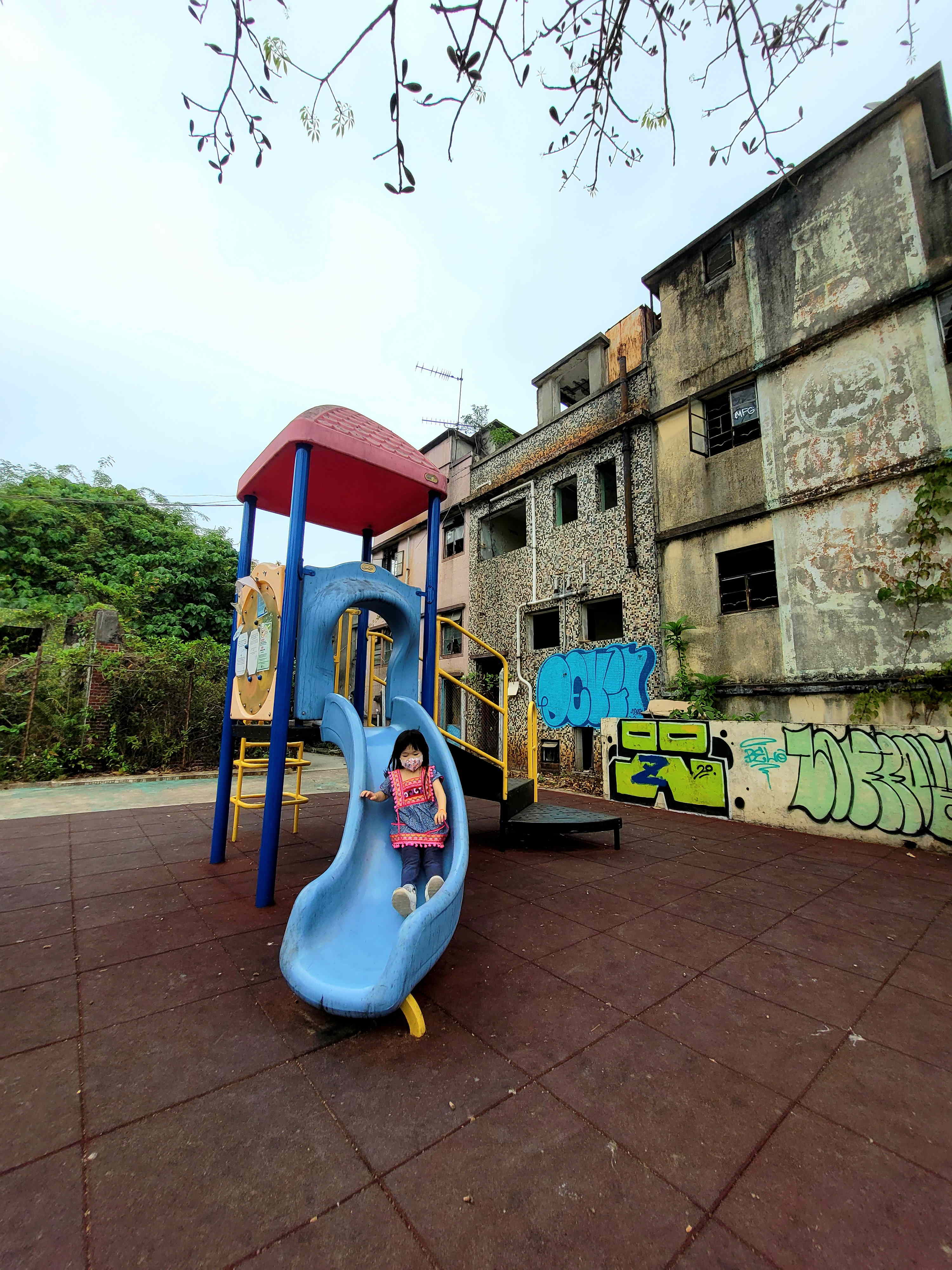 村內嘅荒廢遊樂場,背後有些塗鴉背景嘅建築物,我哋好似去咗另一國度遊玩。