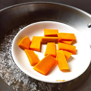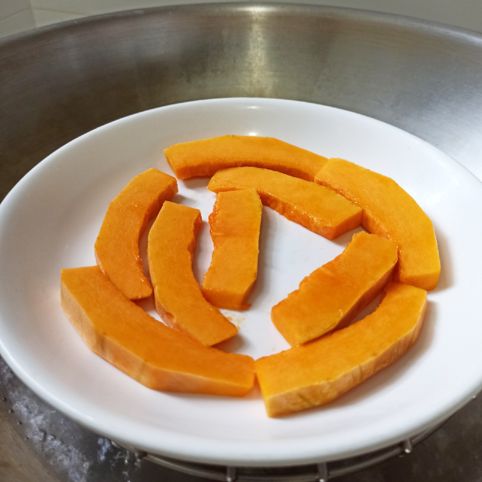 1. 南瓜去皮切件,中火蒸10分鐘放涼