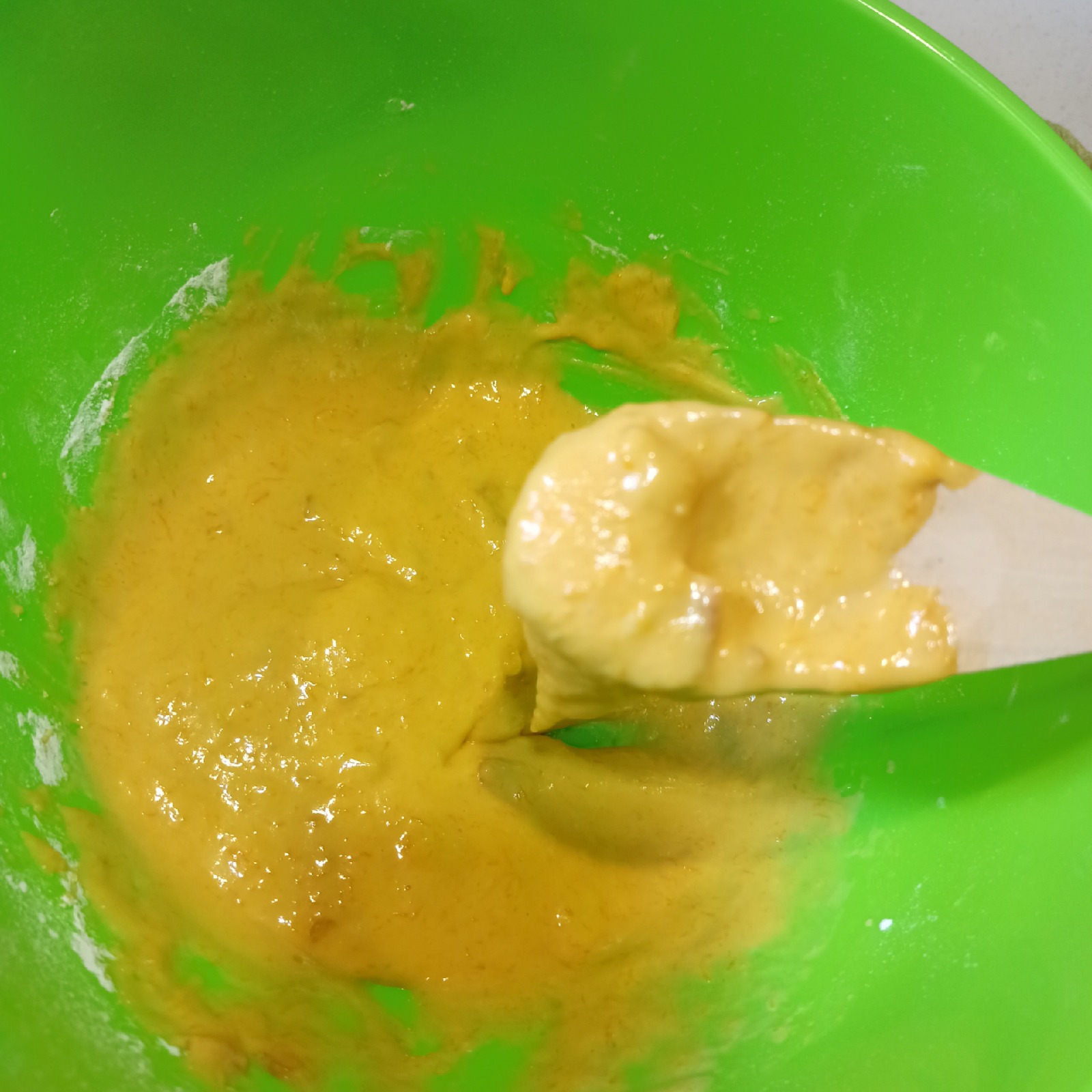 2. 油、水、蛋黃及麵粉過篩,搞拌