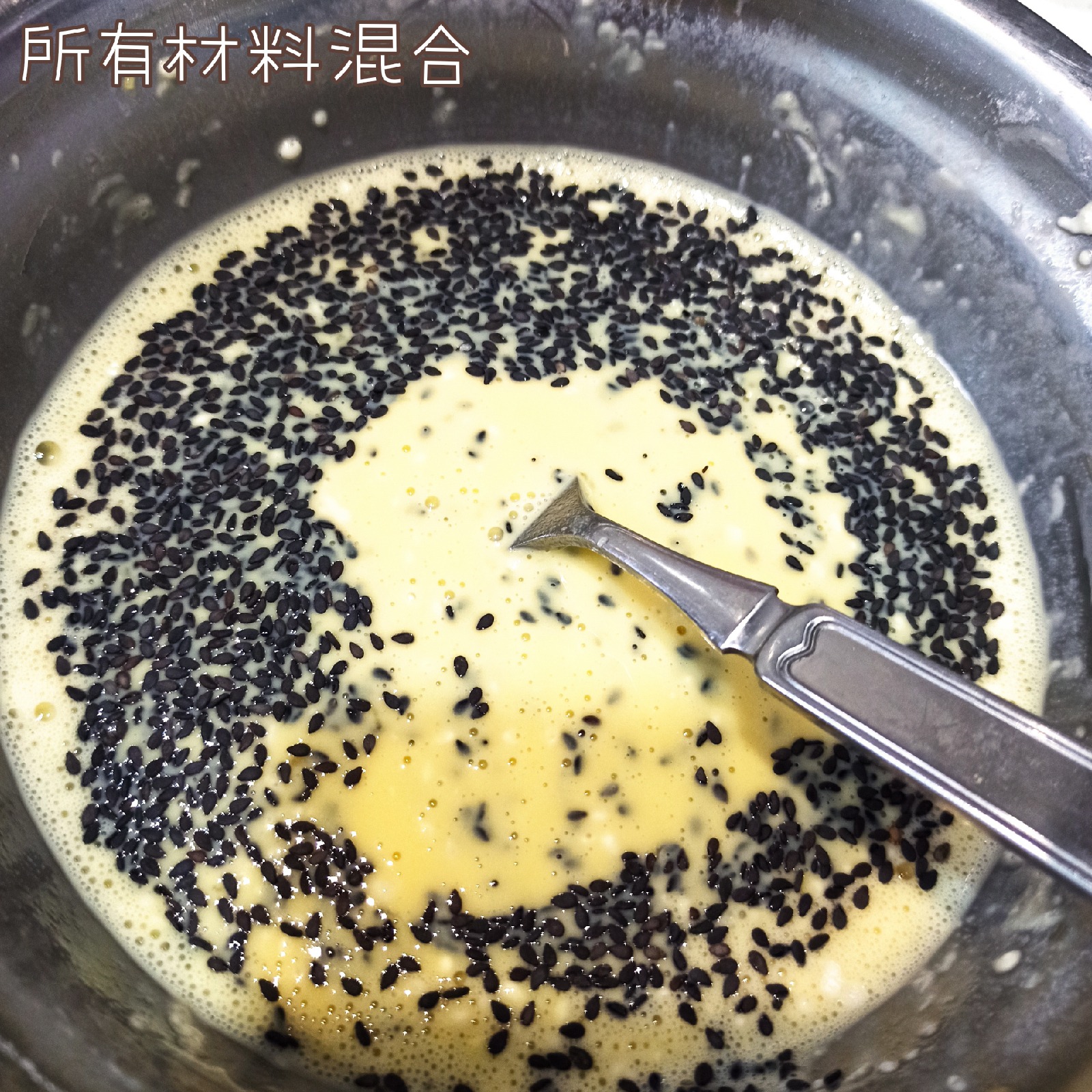 2. 蛋黃,水,黑芝麻醬及麵粉過篩,搞拌
