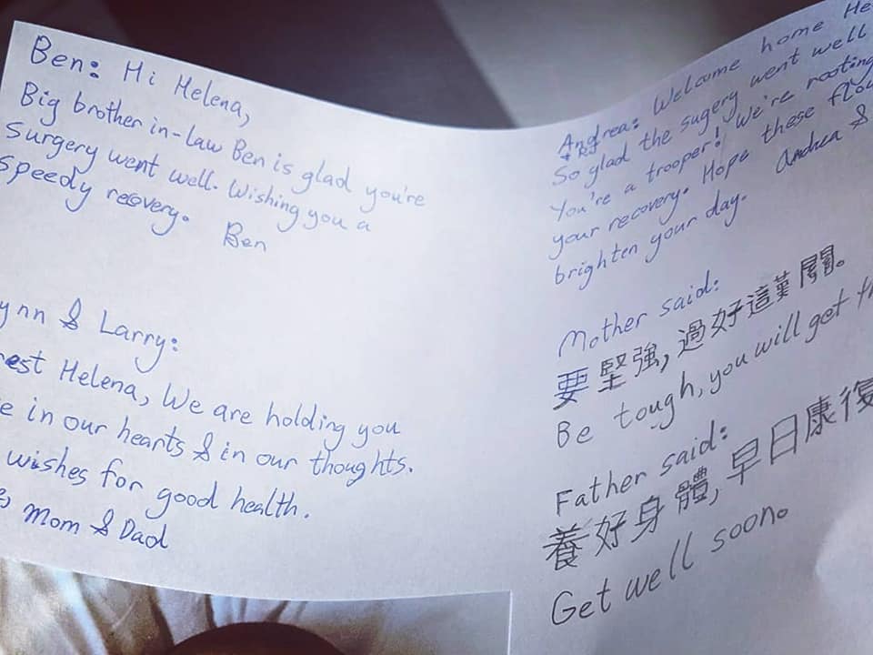 手術前後一兩天的痛楚是最劇烈的了,醫院給我處方的是嗎啡 (Morphine) 和翔考酮 (Oxycodone),這些是戰時軍人用的止痛藥,但也未能完全消除痛楚。原因是那種火燒般的感覺來自葡萄球菌感染 (Staph Infection),要等三天後醫院化驗所的培養基種出菌種才可以更準確配方合適的抗生素,以緩和病情。小百合媽媽之所以八天才能回家,是因為換了抗生素後,白血球指數依然徘徊在三萬,缺鎂、缺鉀,要等一切回到正常水平才可回家見小百合。幸好我先生公司依然因新冠肺炎疫情而只需他在家工作,每天都有他在身邊陪伴我,支持我。