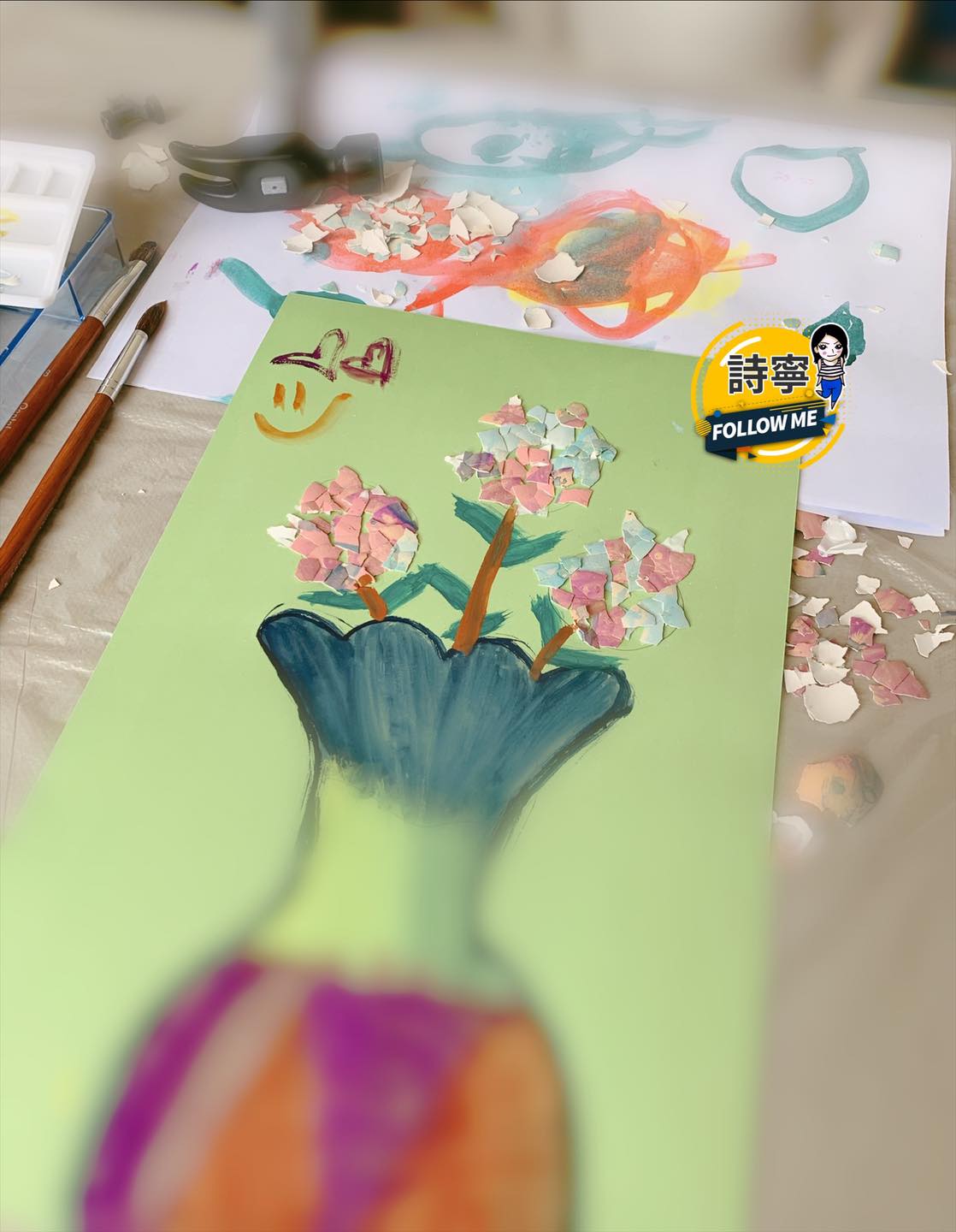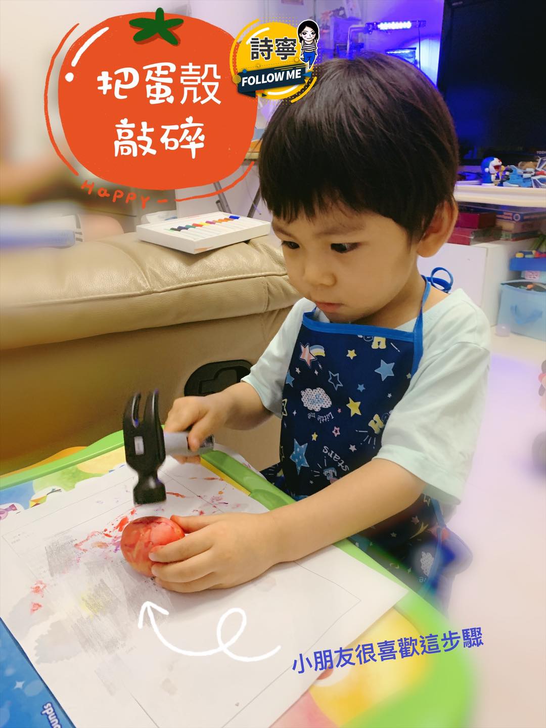 2) 顏料乾透便可以把蛋殼打碎了。小朋友會超喜歡這個步驟,這也有助鍛鍊大肌肉和手眼協調的。手眼協調好,將來寫字都更得心應手。