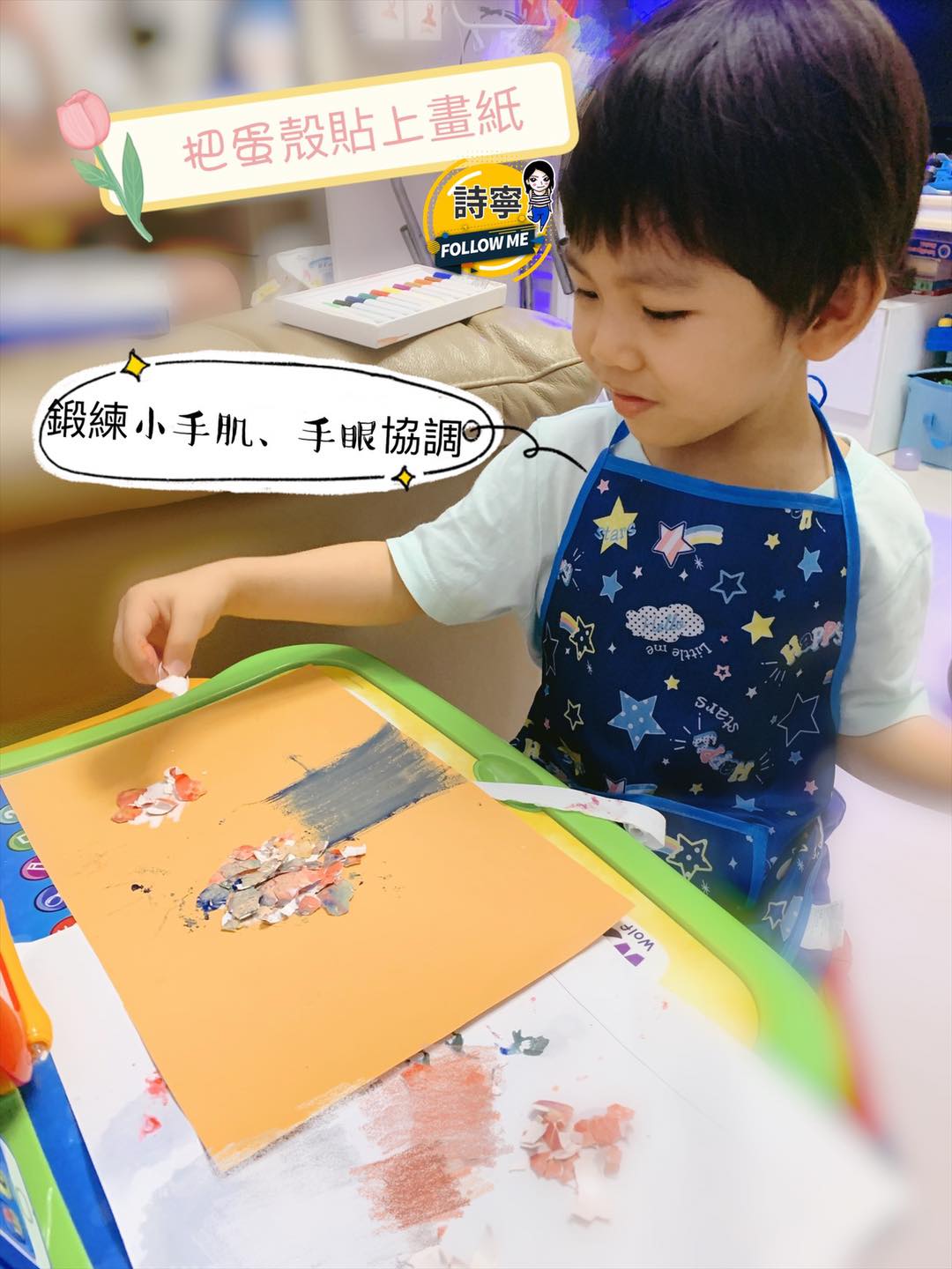 七彩繽紛的蛋殼碎很吸引幼兒眼球。這步驟訓練小肌肉、手眼協調、專注力和耐性,同時也是感統訓練中的觸感練習。