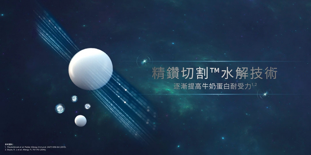 「精鑽切割™水解蛋白」內含由不同的小分子特別排列而成、具獨特性的耐敏蛋白組合,可激發身體耐受性,有助鍛鍊寶寶身體對牛奶蛋白的適應力4,5,令其逐漸接受,降低小敏感風險5,6,7。