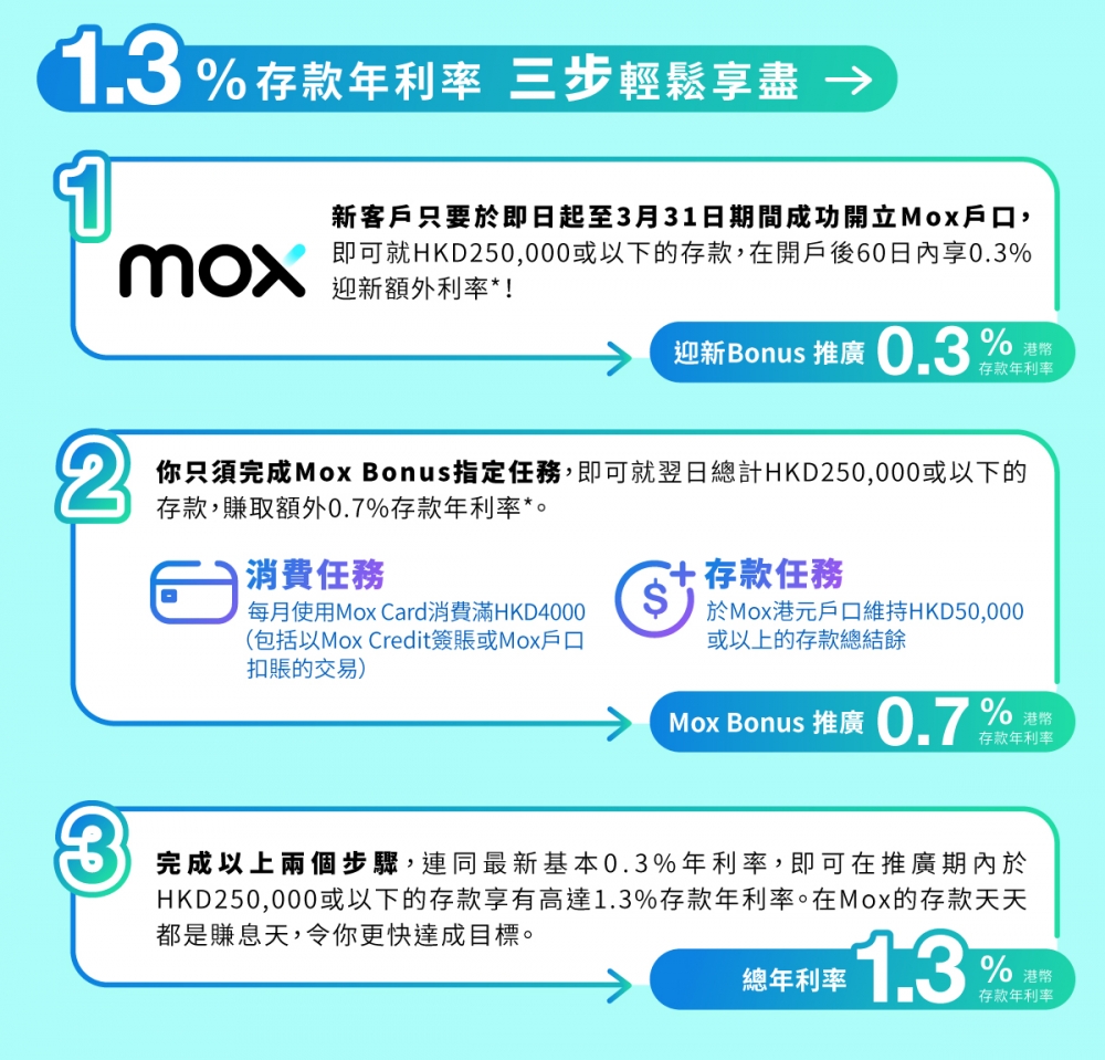 1.新客戶只要於即日起至3月31日期間成功開立Mox戶口,即可就HKD250,000或以下的存款,在開戶後60日內享0.3% 迎新額外利率*!