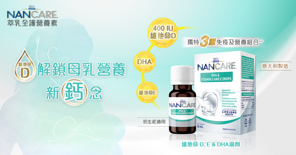 由意大利製造的「雀巢NANCARE®萃乳全護營養素 - 維他命D、E&DHA滴劑」,解鎖母乳營養新「鈣」念!
