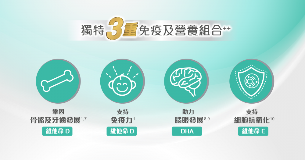 • 蘊含獨特3重免疫及營養組合++守護寶寶骨、腦、眼成長!
