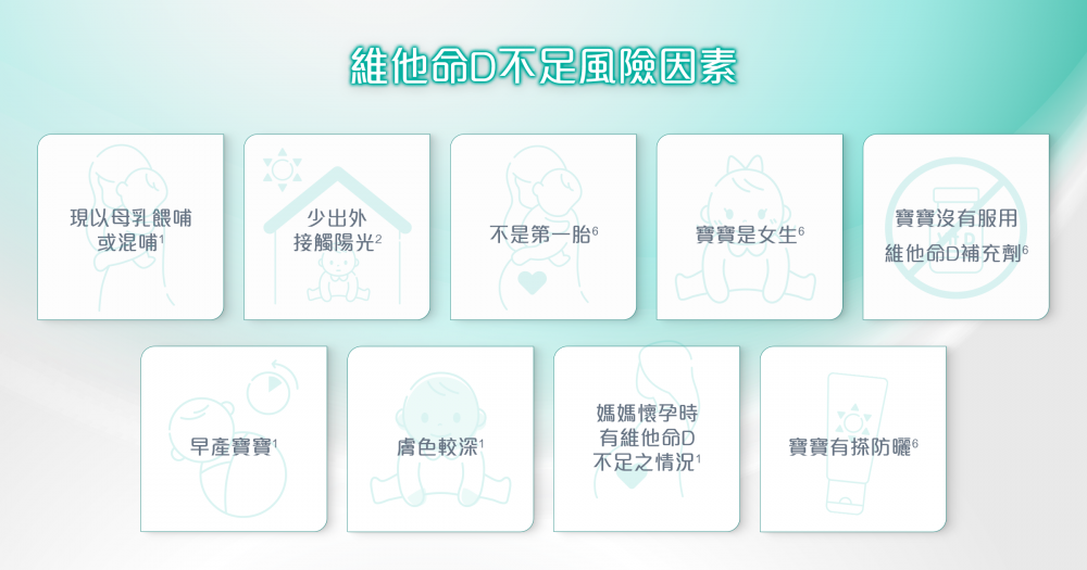 研究指,寶寶有愈多維他命D不足的風險因素,就會有層疊性遞增的風險比率,全母乳或混哺寶寶的維他命D不足風險更可高達40倍6##。