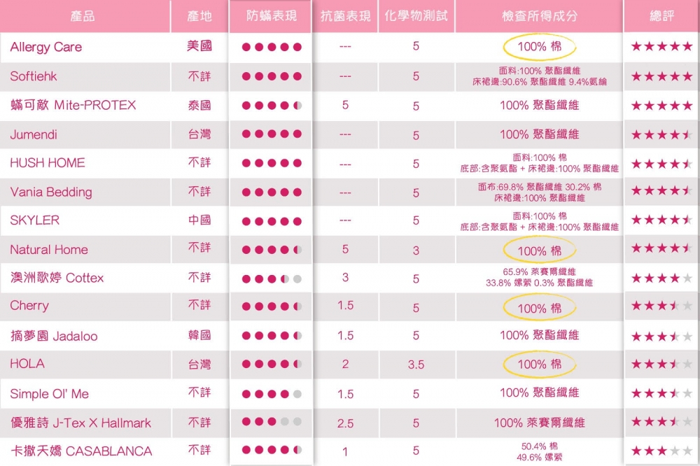 今次消委會測試主要檢視樣本的抗菌和防蟎效能、有害化學物質的含量(偶氮染料和游離甲醛),耐用程度(洗濯後外觀、尺寸等的改變),以及樣本的纖維成分和針數。為了模擬床單日常使用情況, 每款樣本進行試驗前都會按其護理指示先洗濯10次才進行相關測試。根據消委會報告,各項測試如下: