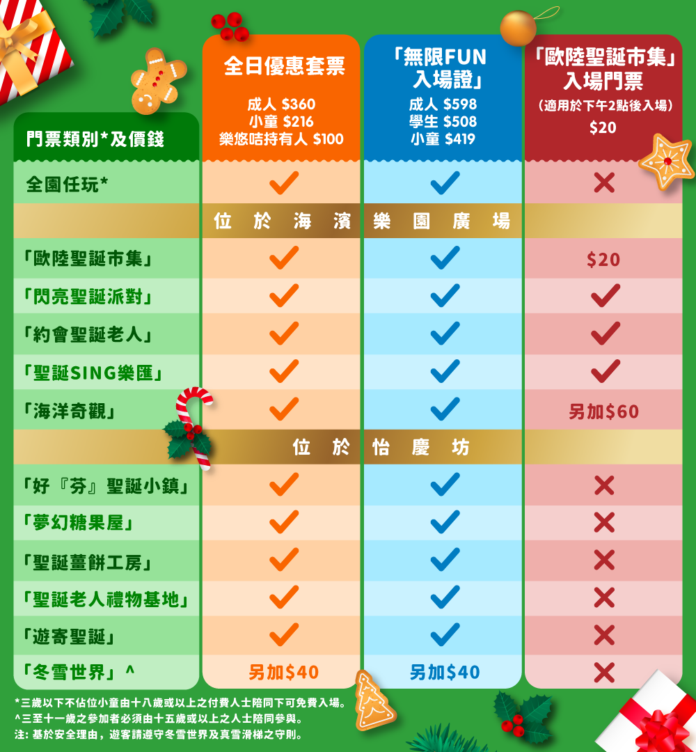 無論是想與小朋友共聚天倫樂,或是與愛侶二人世界,自選入園方式都可以一一滿足你!想玩盡至「芬」聖誕,購買全日優惠套票再加港幣$40一併體驗「冬雪世界」;想Chill遊海洋公園,購買港幣$20「歐陸聖誕市集」入場門票,即可於下午2時後進入「夢幻水都人工湖」及「海濱樂園廣場」到聖誕訪市集,加港幣$60探索「海洋奇觀」欣賞各種珍貴魚類。 一日不夠玩的話,可以購買「無限FUN入場證」無限勁玩到新一年!