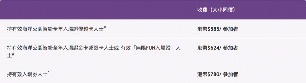 *費用並不包括入場門票,參加者必須持有活動當日有效之海洋公園入場門票。