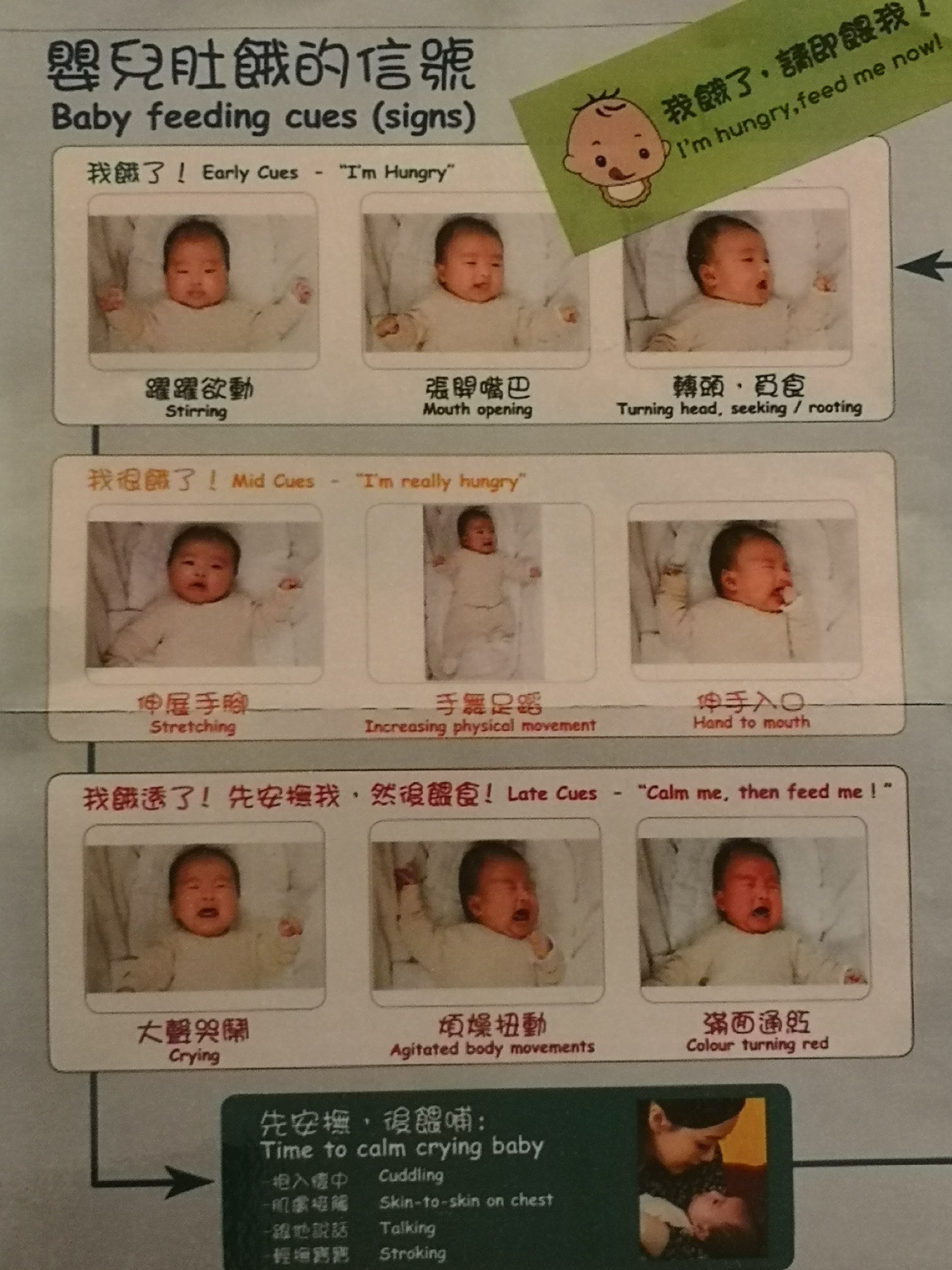 下午時份,陣痛已經去到每2~3分鐘1次。床邊有1張poster教如何分辨bb肚子餓,看著就覺得好討厭,為什麼要苦著自己,生什麼小孩!
