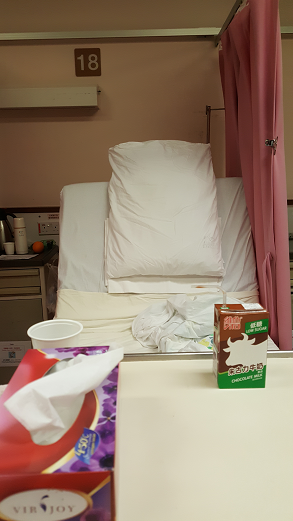 到達醫院時已超過晚上11點,7樓的產前病房貼了通知,移步到產房登記作檢查。在長走廊慢慢走近,看見「產房」字眼突然緊張起來,心跳得很快。進去後左手邊有一整排的LOCKER,很寬敞的空間,有一張床和些儀器,還有2張小沙發。心想:怎麼跟TVB劇中的產房不太一樣.. 哈哈! 跟2位姑娘說明情況後,爸B坐沙發等,偷偷地看到他有眼濕濕,我便上床給檢查,姑娘有溫柔地解釋手探的程序和感覺會有點不舒服,嗯…..雖然平時產檢時都要脫光光,但用手檢查還是第一次蠻尷尬的,姑娘叫我放鬆後就把手指放進去,噢!的確有點痛很不舒服而且事實是不可以做到放鬆啊!檢查後姑娘說宮頸有點點軟,但未開度數,還說之前見紅就應該立即入院。轉身就叫爸B按指示到樓下辦入院手續了。「啊? 這麼快入院是不是代表很快就可以生啦?」我問。姑娘答:「不是,度數還沒開。來了就住院吧,不用走來走去!」隨手就給了粉紅住院服換上了。和登記是想母乳餵還是奶粉餵、爸爸是否陪產。哈? 屯門醫院不是出名床位緊張嗎?這麼快就可以住院? 等爸B辦完手續上來,醫院姐姐用輪椅推送我去產前病房,在門前還跟爸B難捨難離,又一次眼濕濕,好想他可以一直陪著我….