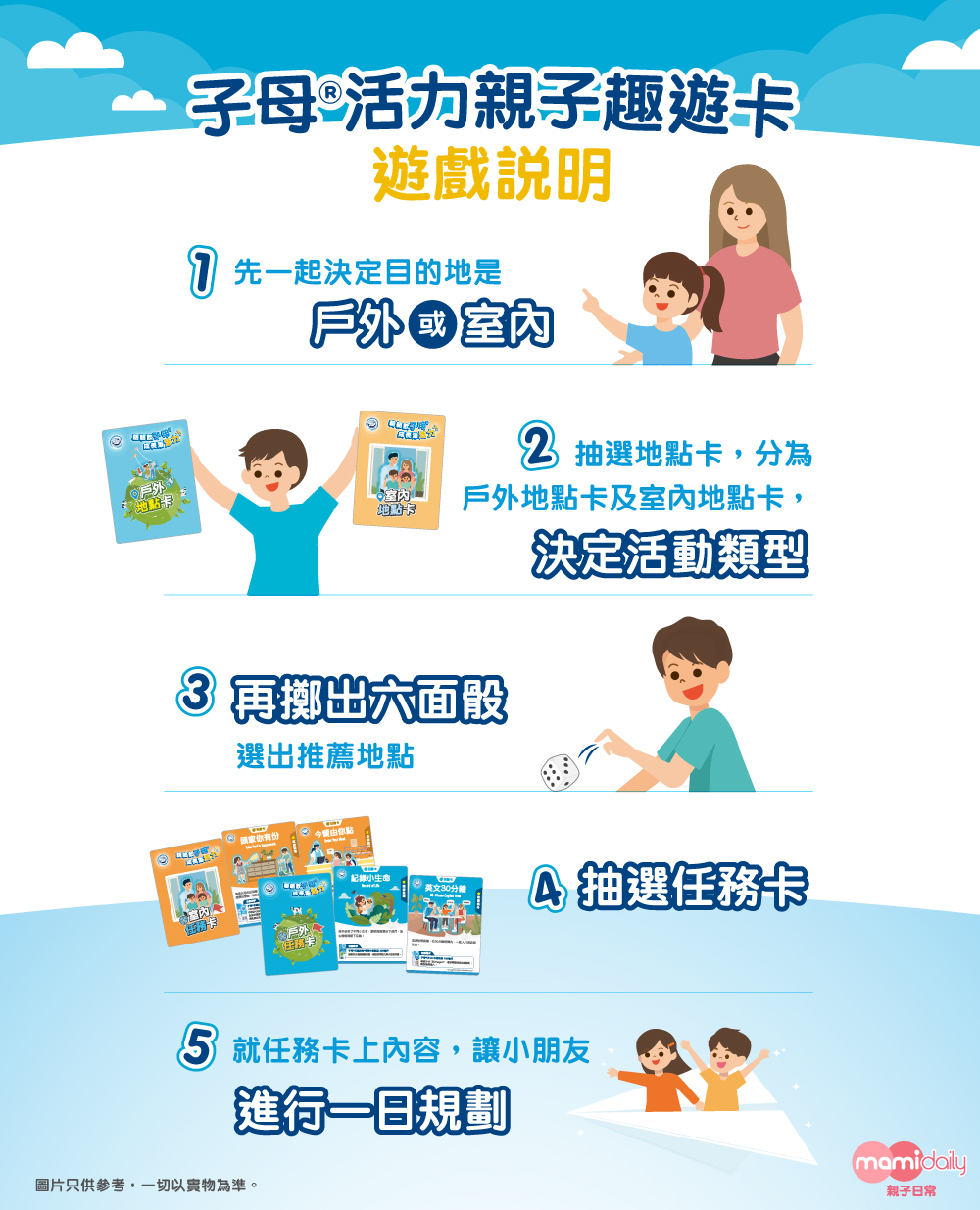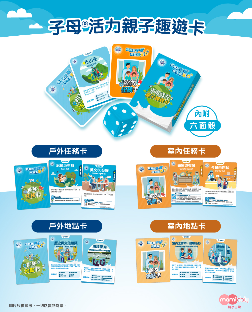 「子母®活力親子趣遊卡」內有六面骰、戶外地點卡、戶外任務卡、室內地點卡及室內任務卡。開始玩前先抽選地點卡,決定目的地及活動類型,再擲出六面骰選出推薦地點,再就任務卡上內容,讓小朋友進行一日規劃。