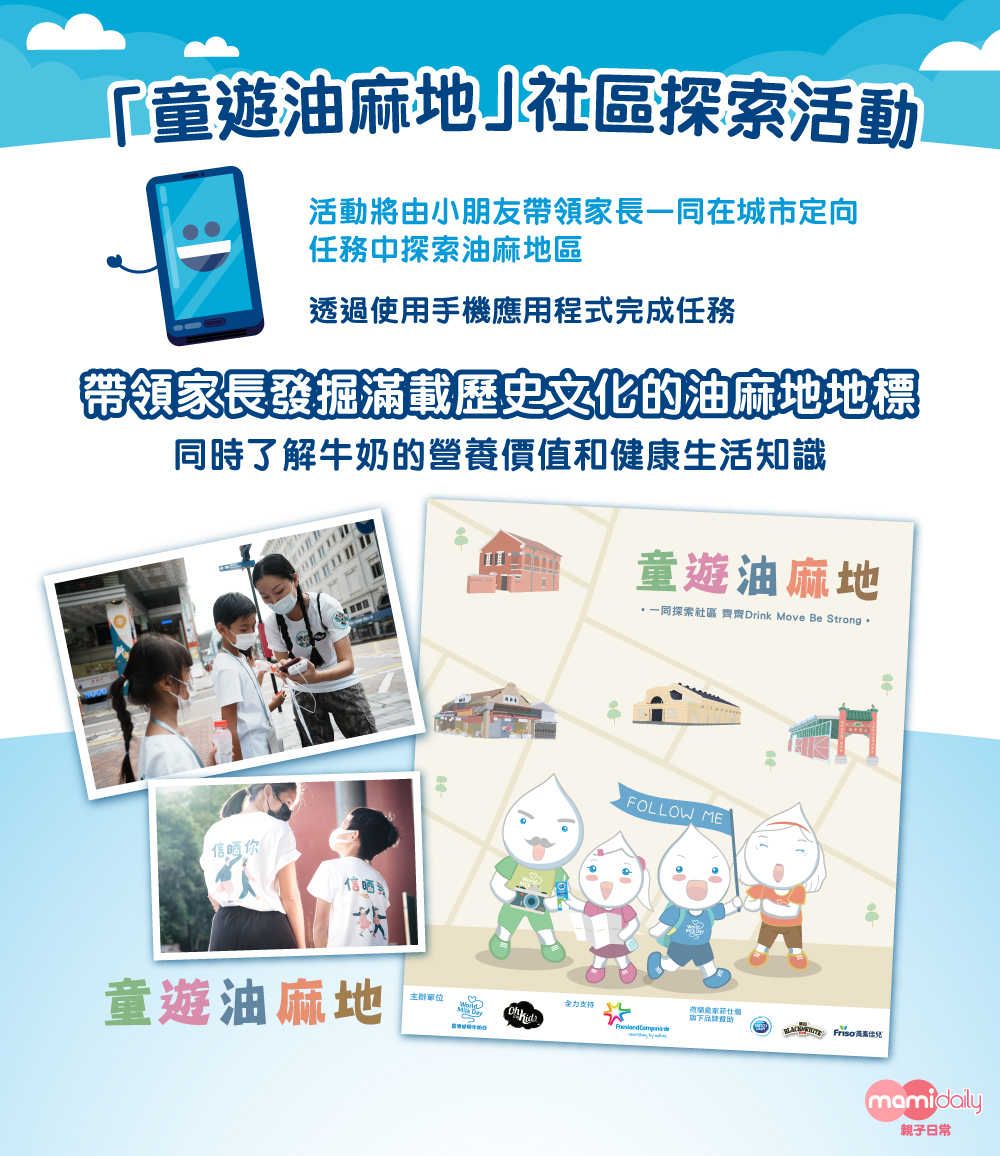 是次活動由「香港世界牛奶日」及 ohmykids 主辦,呈獻皇牌親子社區探索活動「童遊」,更特別設計了全新油麻地路線讓大家挑戰!鼓勵孩子創造,相信孩子,均是成長的重要元素,因此活動將由小朋友帶領家長一同在城市定向任務中探索油麻地區,透過使用手機應用程式完成任務。過程中孩子需要學習看地圖,帶領家長發掘滿載歷史文化的油麻地地標;亦會學習有關牛奶營養的知識和進行充足運動對成長的重要性,鼓勵孩子「Drink.Move.Be Strong」,實踐「2+60」,保持每日補充 2 份奶類[1]及每日做 60 分鐘運動[2]的健康習慣。