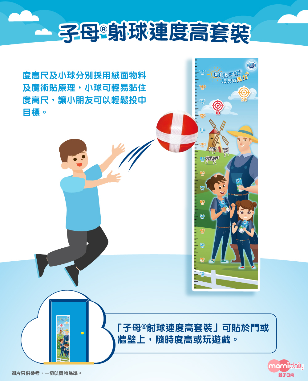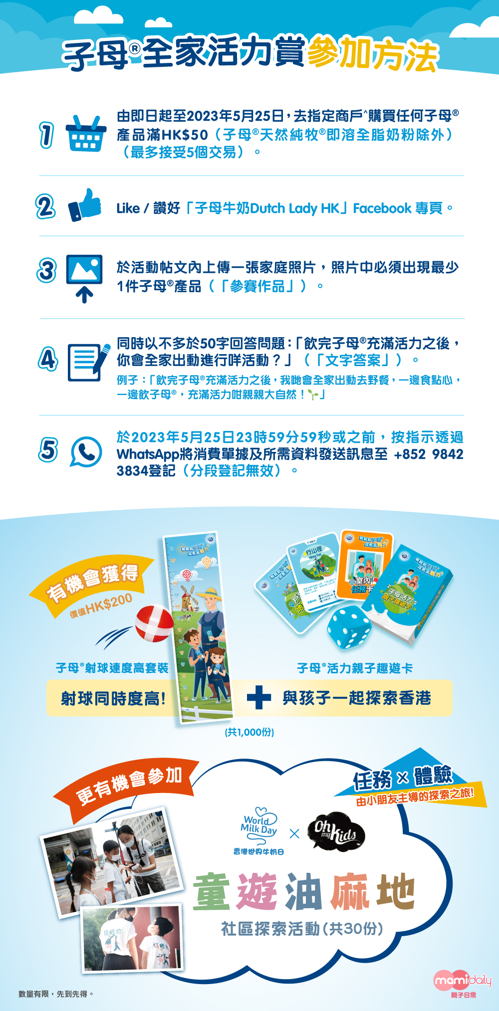 一家人出遊時可以一起運動或進行小遊戲,不但可以一家人動動筋骨,也可以促進小朋友的身心發展,培養自主性,增進家庭成員間的信任。今次子母®特別為各位爸爸媽媽和小朋友推出「子母®全家活力賞」,準備了一系列別出心裁的禮物:「子母®射球連度高套裝」及「子母®活力親子趣遊卡」,鼓勵小朋友規劃假期,讓一家人的共聚時光更有活力更FUN。此外,活動更送出30張香港世界牛奶日及親子創意品牌 ohmykids 合作推出的「童遊油麻地」社區探索活動(子母®特別場)門票,讓親子一同動身遊走和探索城市!