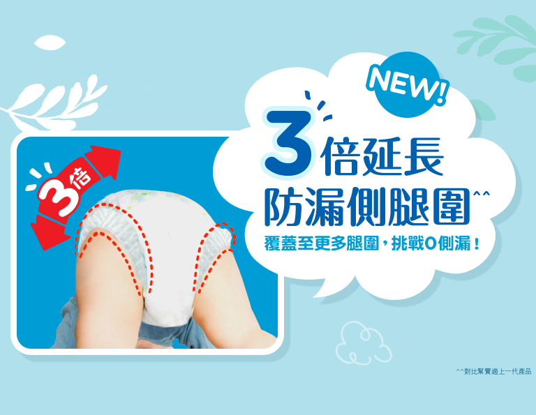 配合3倍延長的防漏側腿圍,既能彈性貼合,亦能覆蓋到更多腿圍,就算BB大動作活動都不怕滲漏及摩擦!