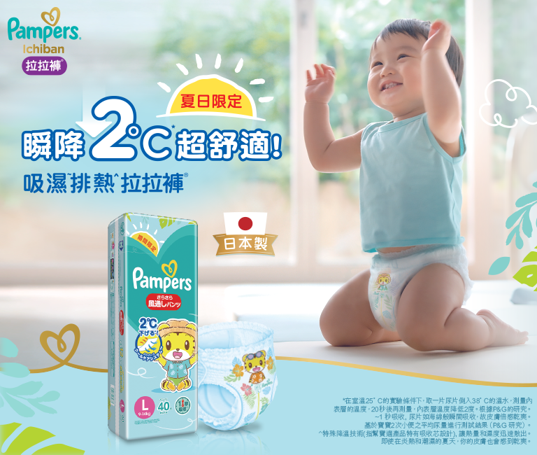Pampers 推出全新夏日限定「Ichiban吸濕~ 排熱^拉拉褲」,具有瞬降2°C*的強大效果。特有的吸收芯設計,幫助尿片內表層迅速導流散熱, BB穿著後超舒適!加上「Ichiban吸濕~ 排熱^拉拉褲」擁有肉眼可見的透氣孔,長達12小時肌膚乾爽"。