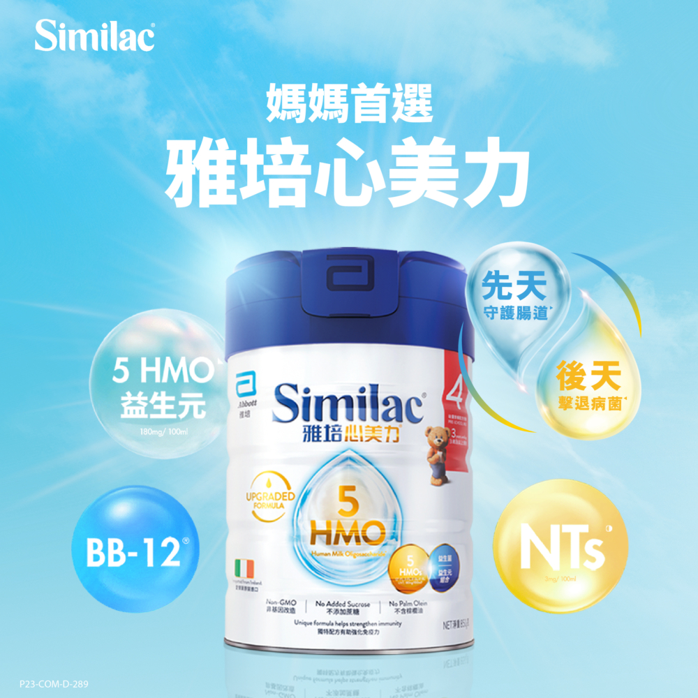 ▼截至2022年6月,與全港主要品牌配方奶粉第4階段產品標籤比較,雅培心美力升級版5HMO的益生元母乳低聚糖組合(2’-FL, 3-FL, 3’-SL, 6’-SL, LNT) 含量最高,合共180毫克/100毫升,非源自母乳。