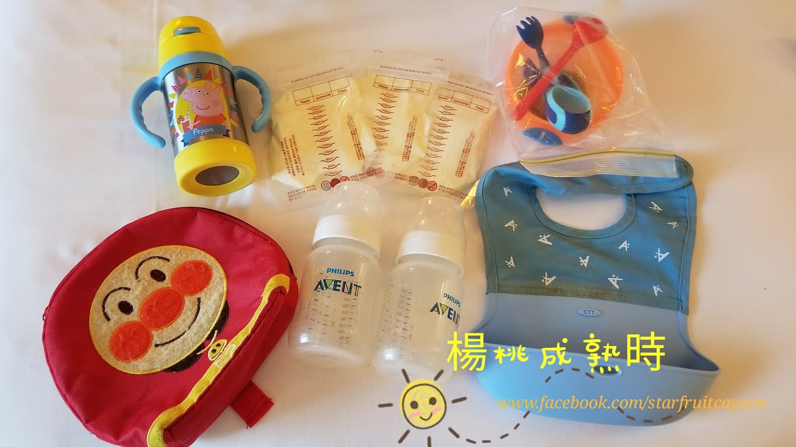 除了睡覺外,吃飯亦是一大問題。雖然桃已經快兩歲但仍是一個奶痴,每晚都需要奶睡,所以奶樽是必須的,而奶粉就用奶袋分開裝好。