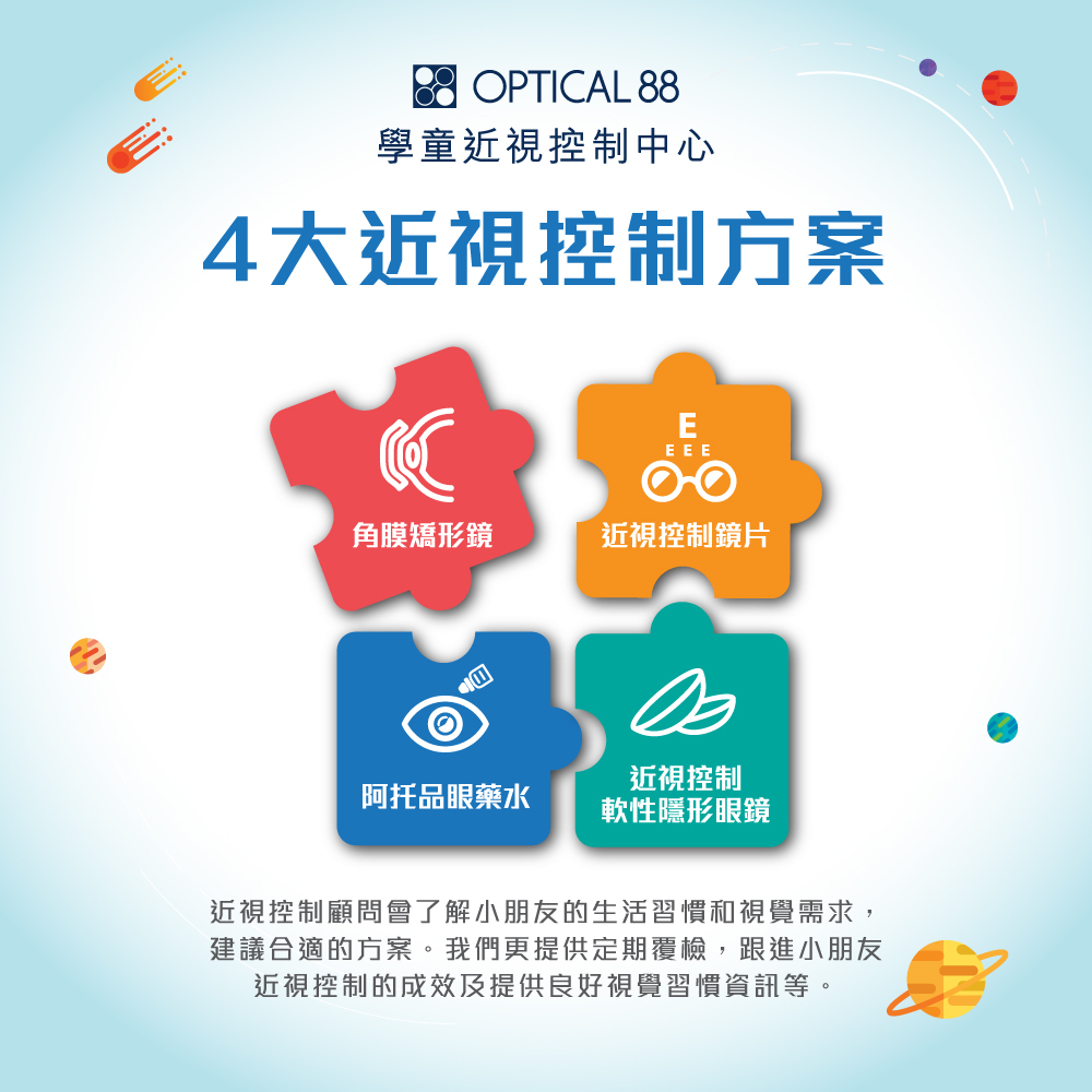 眼鏡88一向以提供優質和忠誠的專業服務為宗旨,全面關注顧客的眼睛健康。其中「4大近視控制方案諮詢服務」是特別針對亞洲兒童近視率偏高及患上近視年齡越趨年輕的情況而設立。為有近視的兒童及其家長提供專業的檢查和建議,並作針對性的近視控制療程以延緩近視加深的速度。預防勝於治療,深近視是很多致盲眼疾的病源,若兒童患上近視,家長應考慮及早採用近視控制方案。