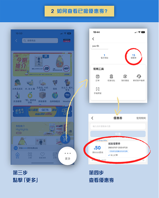 要搶優惠券當然要有攻略!領券方法相當簡單,只要於yuu首頁按「新客專享限時優惠」Banner進入活動頁面即可搶券,成功搶到後,於右下方「更多」點擊「優惠券」即可查看已領取的優惠券。優惠券有效期為領券後14日,留意要於指定日子內使用!而上文提到的惠康、萬寧、7-Eleven折扣碼使用方法亦一樣,於「優惠券」頁面的「優惠券代碼」一欄輸入相應優惠碼即可享有折扣!