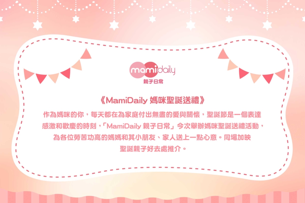 作為媽咪的你,每天都在為家庭付出無盡的愛與關懷,聖誕節是一個表達感激和歡慶的時刻,「MamiDaily親子日常」今次舉辦媽咪聖誕送禮活動,為各位勞苦功高的媽媽和其小朋友、家人送上一點心意。同場加映聖誕親子好去處推介。