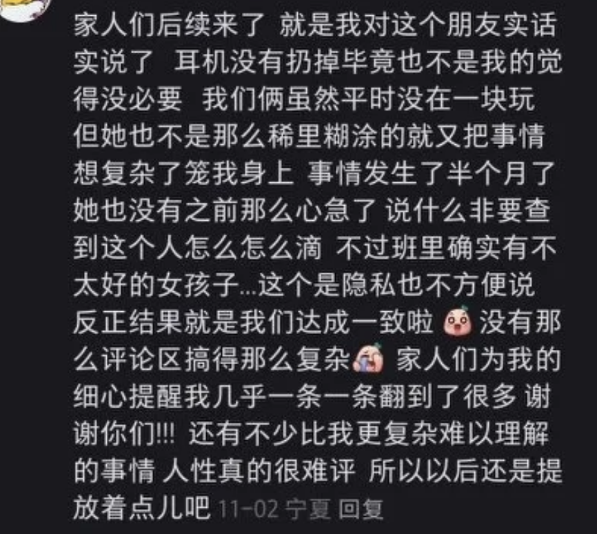 經過心思熟慮,事主已有決定,並在後續補充了她的經歷。原來她選擇實話實說,也沒有扔掉耳機,因為不是她偷的,她覺得行得正企得正,沒必要偷偷躲躲,「我們倆雖然平時沒在一塊玩,但她(失主)也不是那麼稀里糊塗的就又把事情想複雜了籠我身上,事情發生了半個月了,她也沒有之前那麼心急,說甚麼非要查到這個人怎麼怎麼滴(的)」。