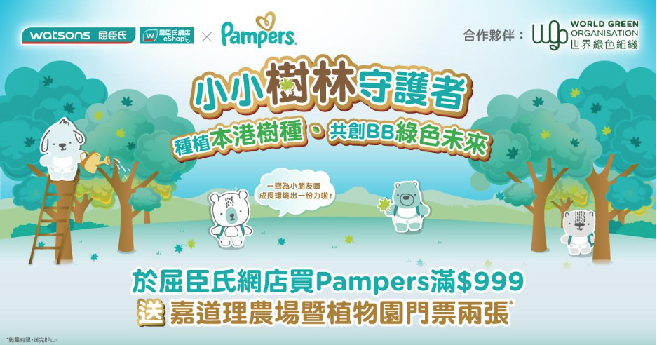今年 Pampers 將與屈臣氏以及世界綠色組織合作推出「小小樹林守護者」計劃, Pampers 會捐出部分活動所得,支持世界綠色組織於沙頭角農場種植本地原生樹種楓香葉,預計將會種下180棵樹苗,相當約一個籃球場面積嘅楓香林。種植本地樹種可以幫助改善本港生態系統嘅多樣性,BB 都可以享受一個更好嘅成長環境!