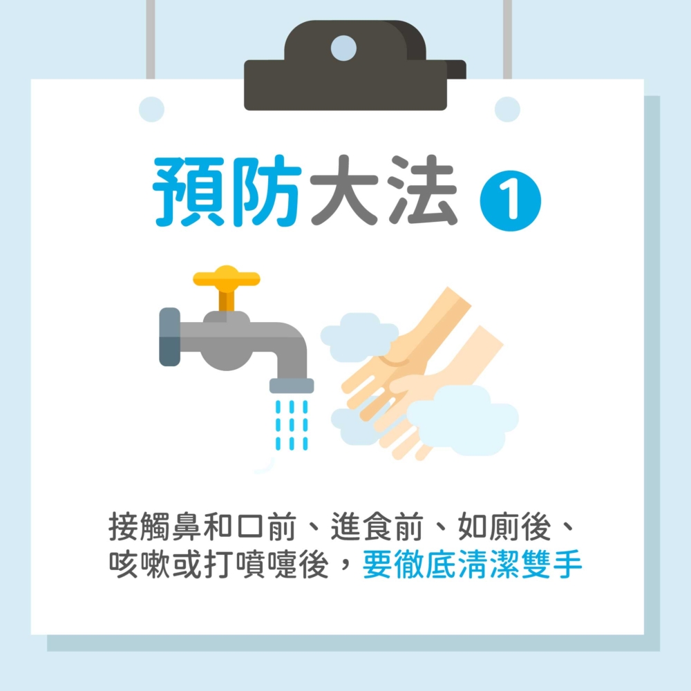 ‧接觸鼻和口前、進食前、如厠後、咳嗽或打噴嚏後,要徹底清潔雙手。
