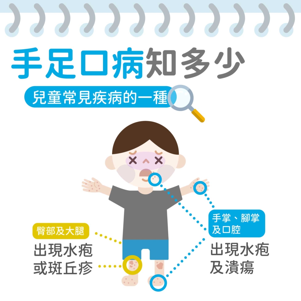 在香港,初夏至秋季是手足口病的高峰期,但冬季亦有機會出現小高峰。兒童的手掌、腳掌出現紅疹、水疱、甚至口腔出現水疱和潰瘍,及發高燒等,可能是患上手足口病的徵狀。手足口病是由腸病毒所引致,雖然一般都會自行痊癒,但由腸病毒71型所引致的手足口病,可能會出現一些嚴重的併發症,後果可大可小,所以家長切勿掉以輕心。事實上,兒童保持個人衞生習慣最為重要,勤洗手、有均衡飲食,及避免接觸患者的分泌物、唾液、穿破的水疱或糞便等,都是有效的預防方法。只要做足以上功夫,手足口病就冇有怕喇!