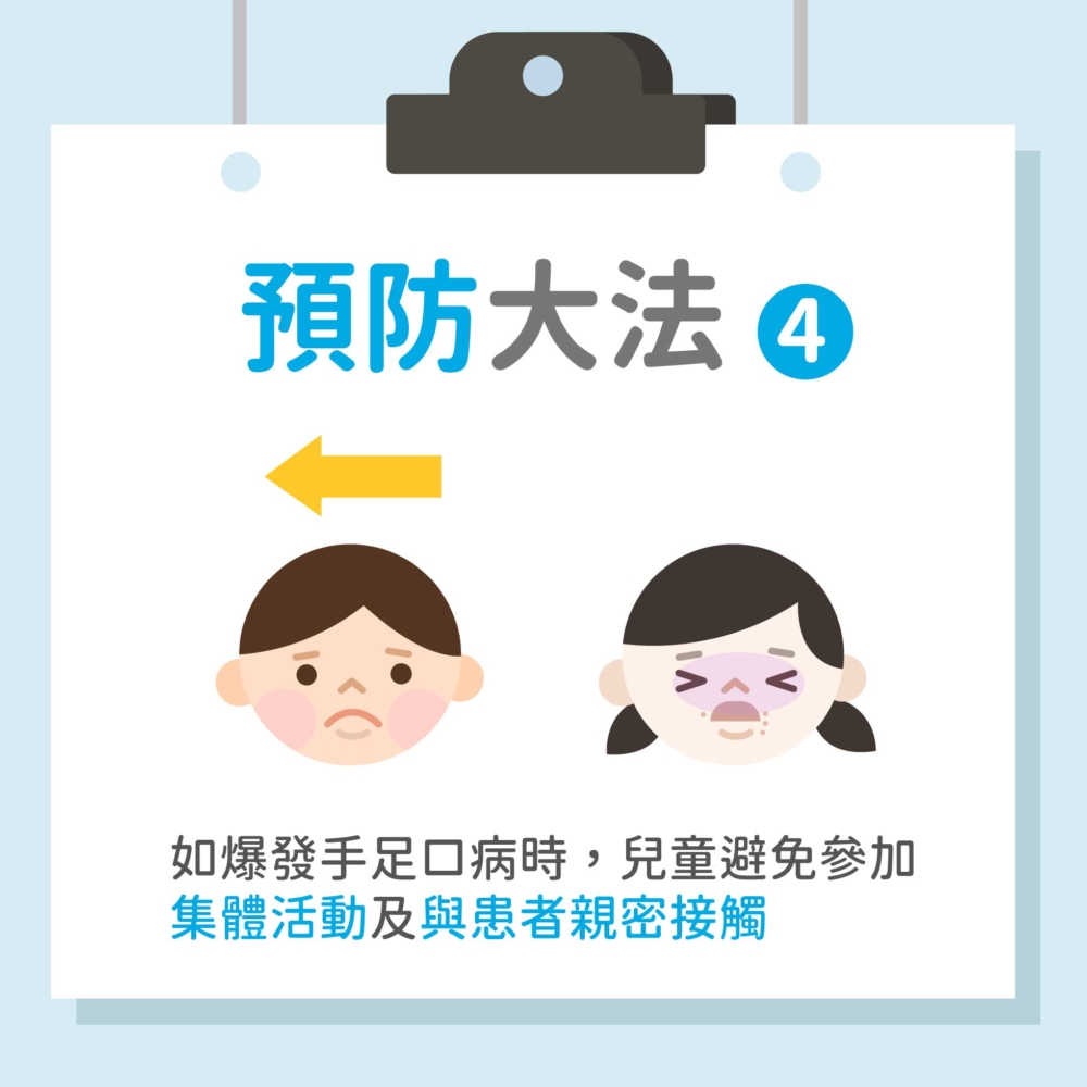 ‧如學校等地方爆發手足口病時,兒童應避免參加集體活動,及避免與患者有親密的接觸。
