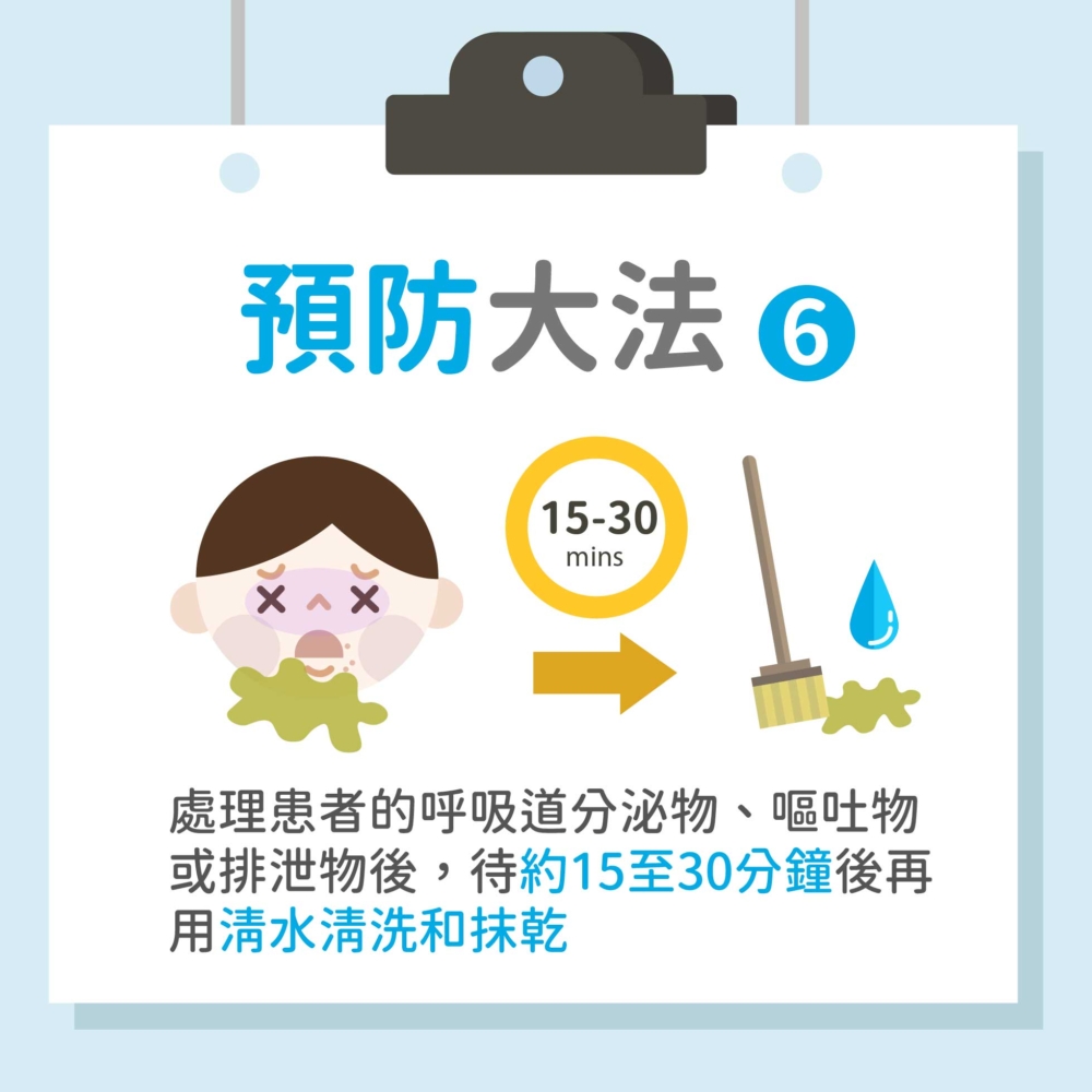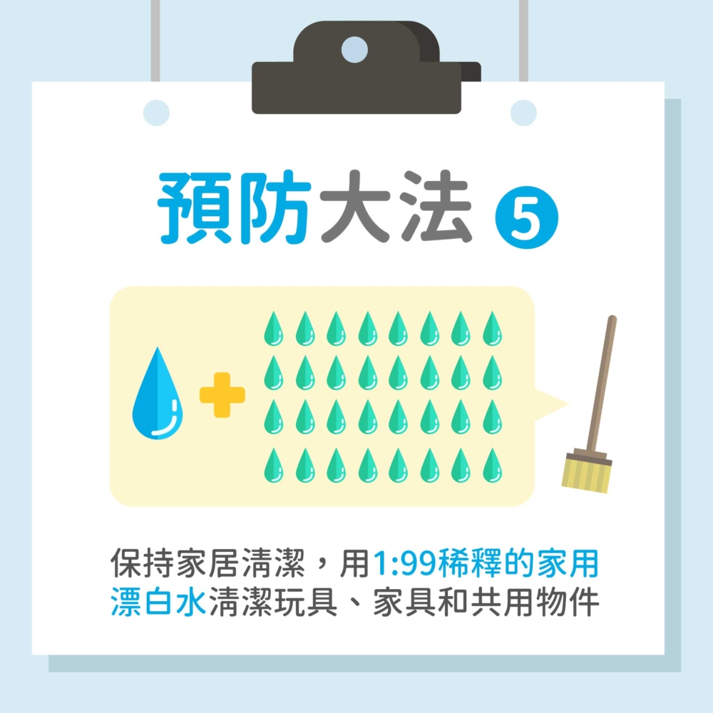 ‧家長平時要保持家居環境清潔衞生,可以用1:99稀釋的家用漂白水清潔玩具、家具和一些共用物件,及處理患者的呼吸道分泌物、嘔吐物或排泄物,待約15至30分鐘後可以再用清水清洗和抹乾。