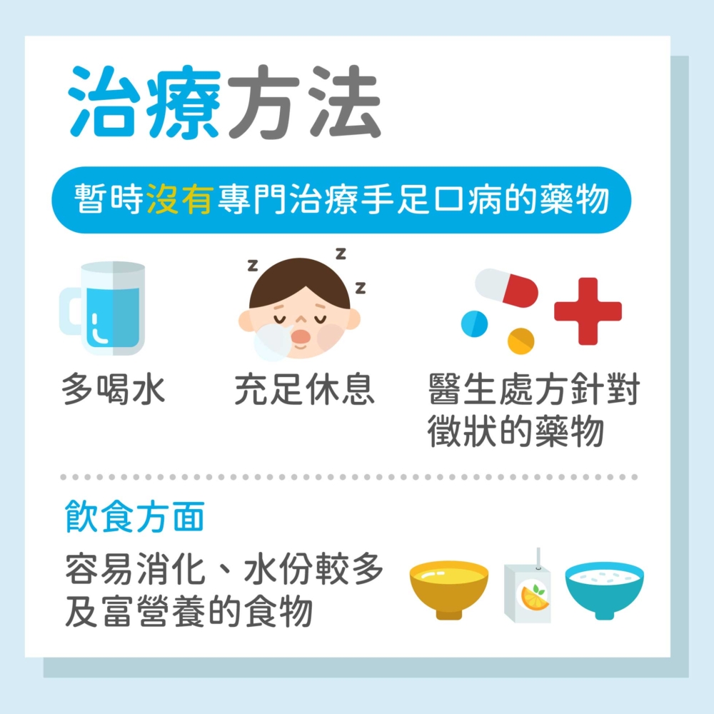 當兒童出現以上手足口病的病徵時,最好去求診,但暫時沒有專門治療手足口病的藥物,醫生會處方一些針對治療患者徵狀的藥物,例如紓緩發燒和口腔潰瘍等藥物;患者要多喝水和在家中有充足的休息便可;在飲食方面,家長最好選擇一些較容易消化、水份較多,及富營養的食物給兒童進食。兒童患病期間,家長要留意他們的病情,如出現持續發高燒、脫水、食慾不振、神情呆滯、情緒異常暴燥,或病情惡化等情況便要立即求醫,接受進一步治理。