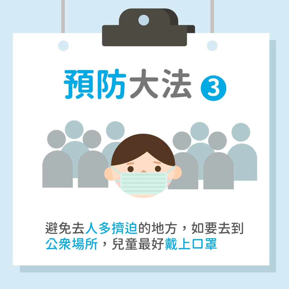 ‧避免去到人多擠迫的地方,如要去到公眾場所,兒童最好戴上口罩。