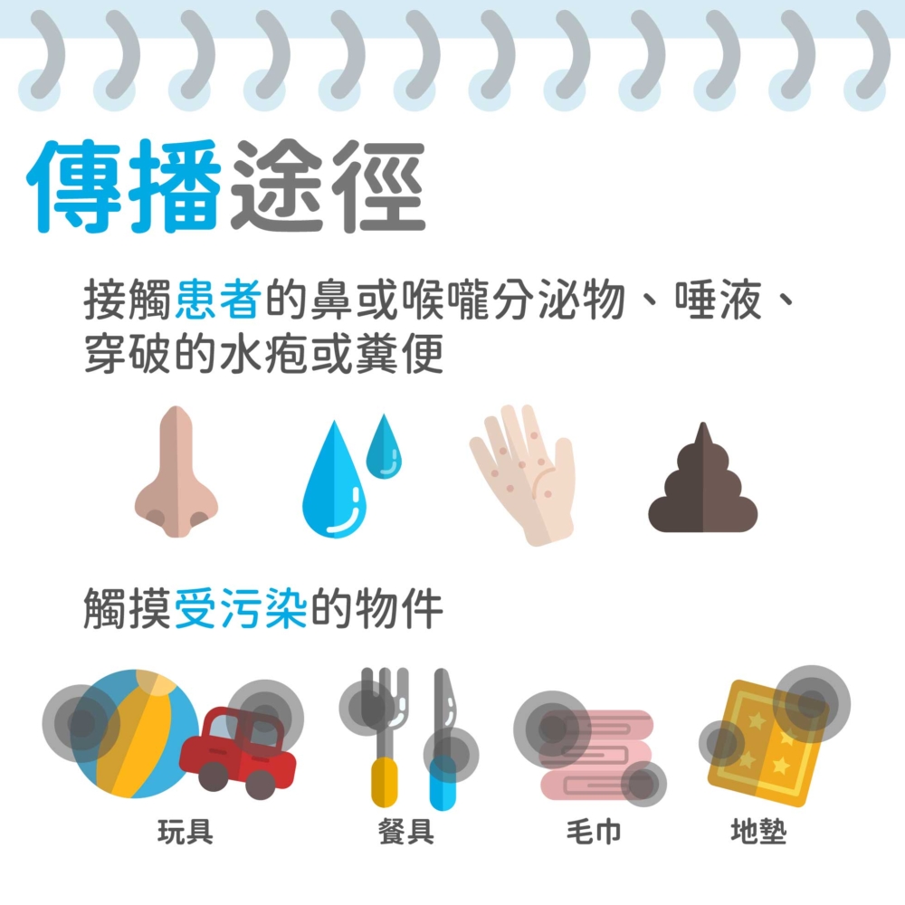 手足口病主要的傳播途徑是接觸患者的鼻或喉嚨分泌物、唾液、穿破的水疱或糞便,或觸摸受污染的物件,包括玩具、餐具、毛巾及地墊等而受感染,潛伏期約3至7天。而患者在病發首星期是最具傳染性,而病毒亦可以在糞便中存活數星期,所以為避免將病毒傳染給其他人,患者要避免上學或參加群體活動,直至水疱結痂。如患者感染的是由腸病毒71所引致,患者要待完全康復(退燒、紅疹完全消退及所有水疱結痂後)後,最好再留於家中休息兩個星期才正式上課,以策安全。
