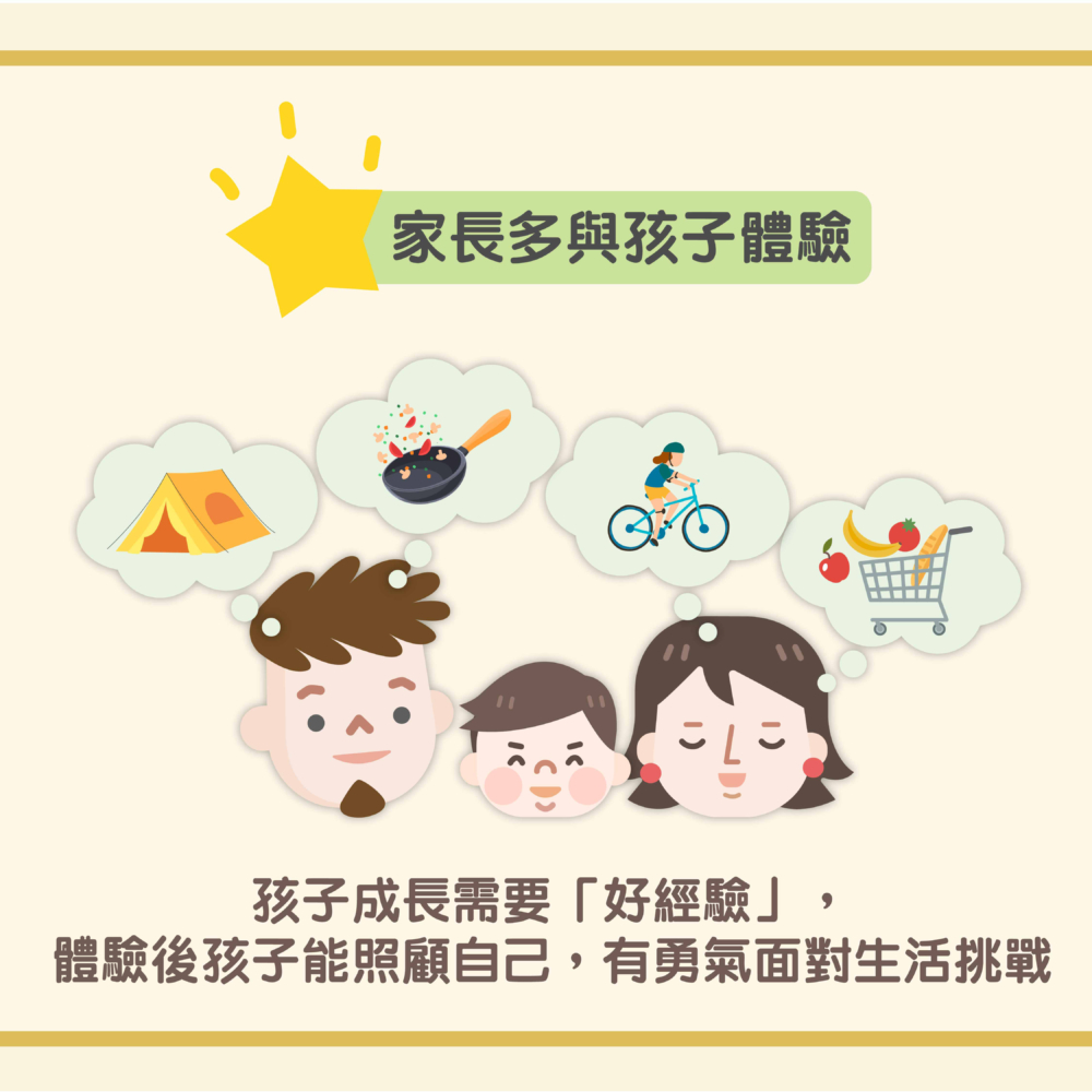 讓孩子成長,他們需要的不止是教導,更需要「好經驗」。家長可在長假期,與孩子一齊放下生活擔子,進行多元化的體驗及活動。筆者曾與丈夫及6歲女兒,在聖誕節假期進行3日2夜露營之旅,帶着孩子一起動手搭帳篷,一同鋪床及開睡袋、煮菜做飯,一家遠離生活的壓力,讓生活回歸到最原始的狀態,過後發現小孩更能照顧自己,有勇氣面對生活挑戰。