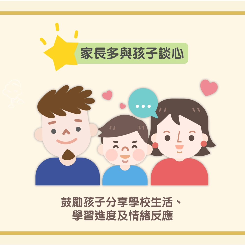 雖然開學3個多月,但真正的挑戰現在才開始。家長可以在孩子放學回家後,刻意製造親子談心時間,鼓勵孩子分享學校生活、學習進度及情緒反應;家長也可與他們一齊完成功課及進行預習。當孩子完成學校任務時,家長記得給予鼓勵和欣賞,讓他在開學初期已有成功感,為小學生活建立良好基礎。