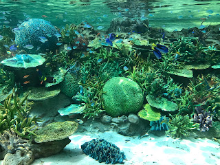 赤道之海   - 珊瑚礁大型水槽:仿照澳大利亞東海岸的大堡礁。旅客可以從三個方向看到水族箱:水族箱的底部(1F),側面(2F)和頂部(3F)。