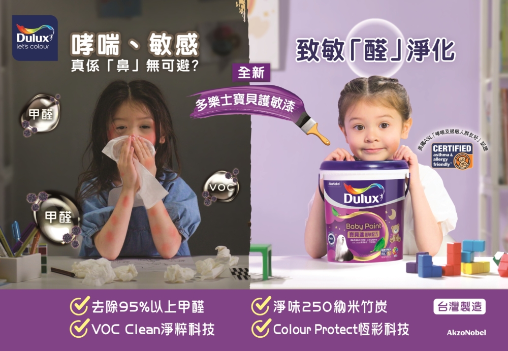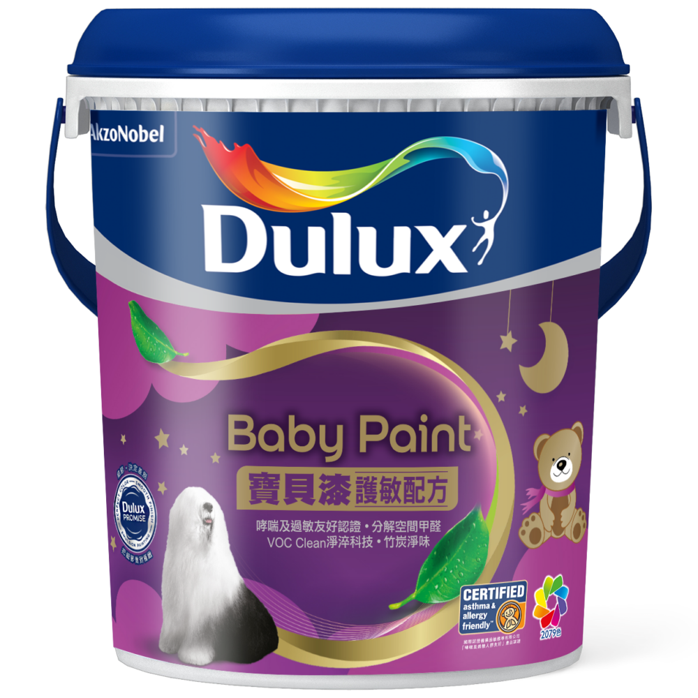 選用認證油漆不但可去除95%以上甲醛,更可以減少致敏原,令寶寶在安全的環境下成長,多樂士「寶貝護敏」乳膠漆是一款專為有寶寶及兒童的家庭而設的高科技環保牆面漆。嚴選頂級安全環保原料,從源頭控制致敏原,符合國際認證機構過敏標準有限公司(ASL)的嚴苛標準,獲得美國ASL「哮喘及過敏人群友好」產品認證。塗刷後牆面更潔淨溫和,更適合易敏、哮喘人群及兒童。